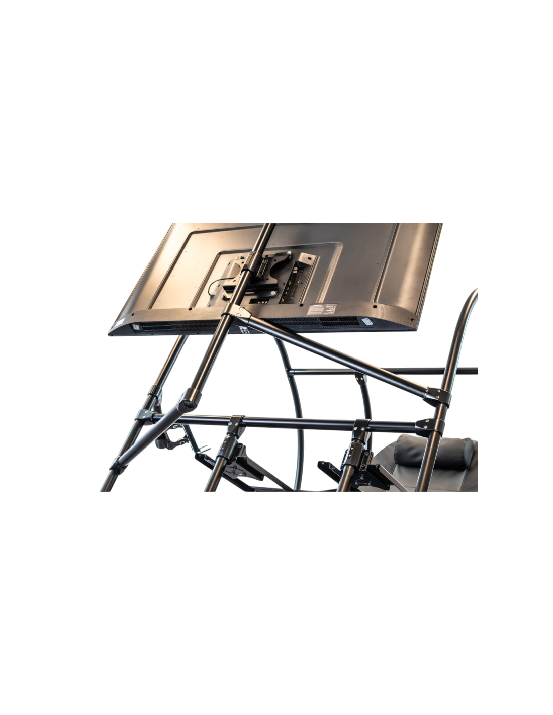 The extension consists of 3 aluminum pipes with 4 pipeholders that would bring a monitor mount vertical pipe beyond the core frame structure and thus extend the eye-screen distance. Monitor / TV Holder with a 20x20 cm VESA mount pattern is also included. If your Monitor / TV has other mount thread dimensions (e.g. 20 x 40cm or larger) you can get a simple VESA Adapter at your local hardware vendor to attach to our 20x20 VESA mounting plate