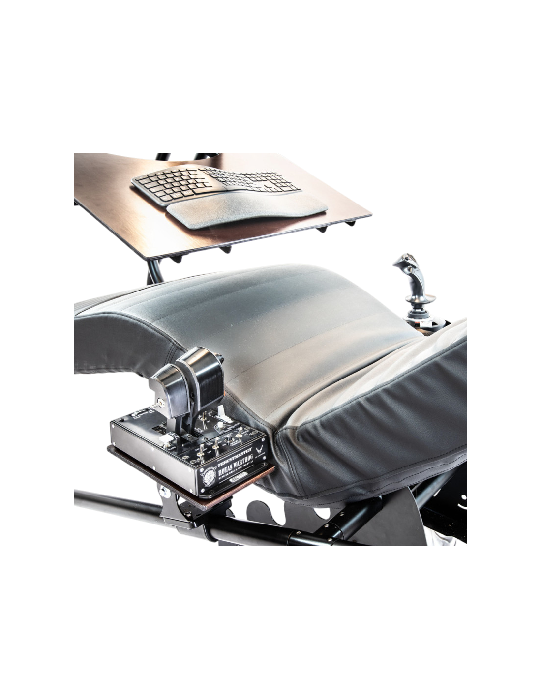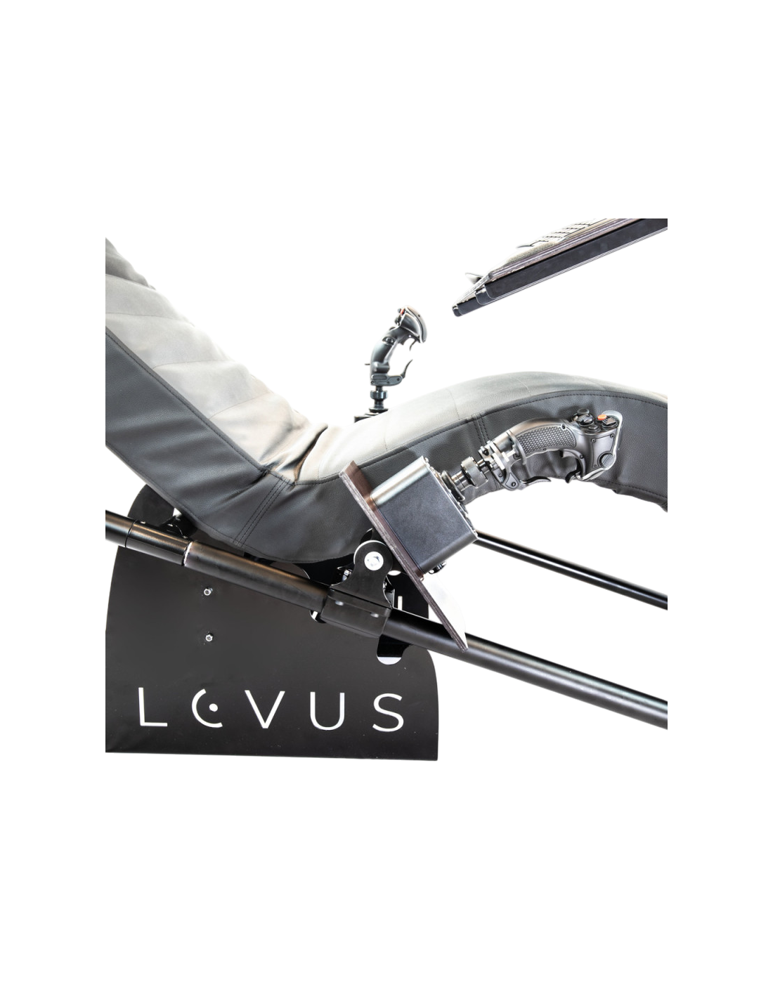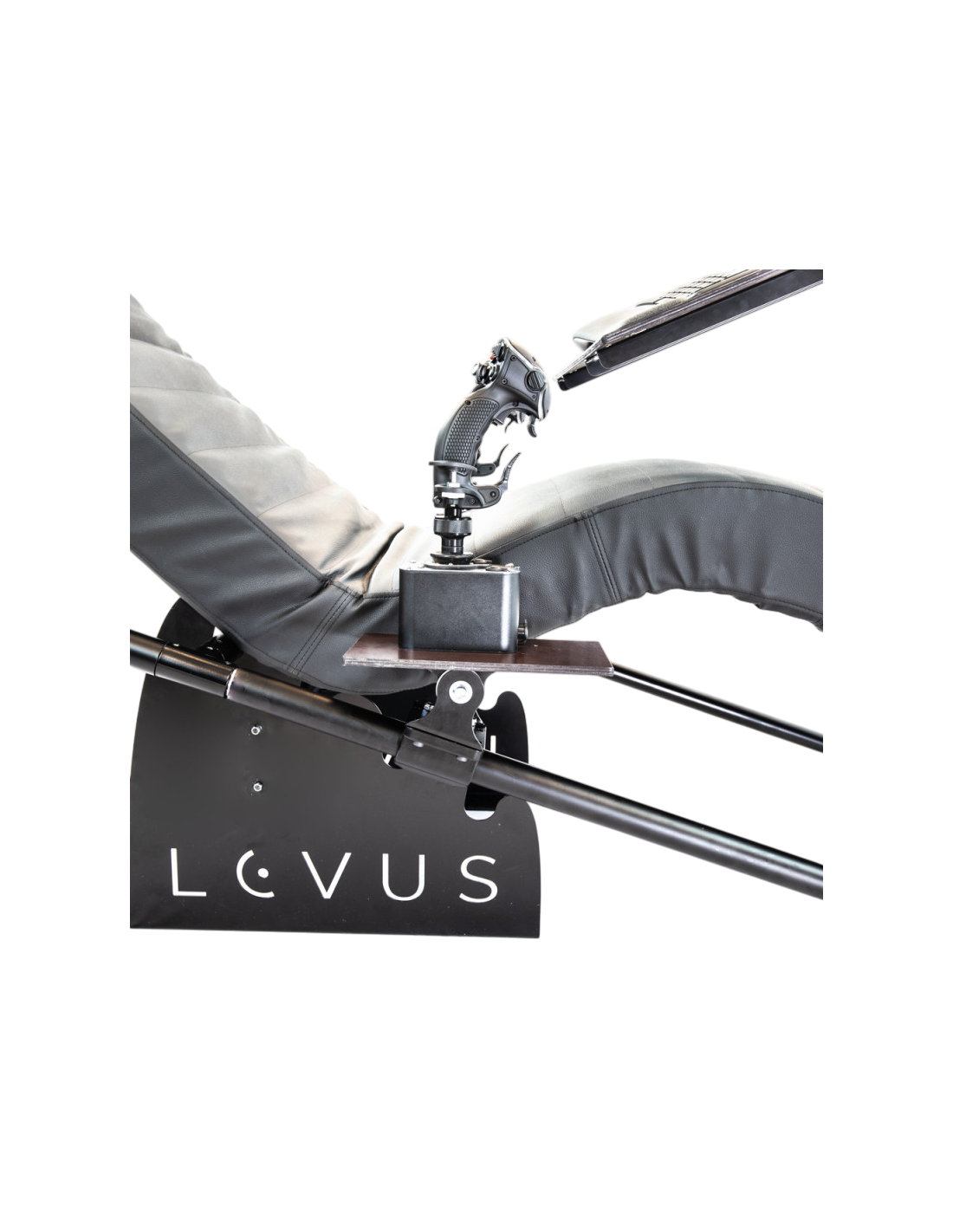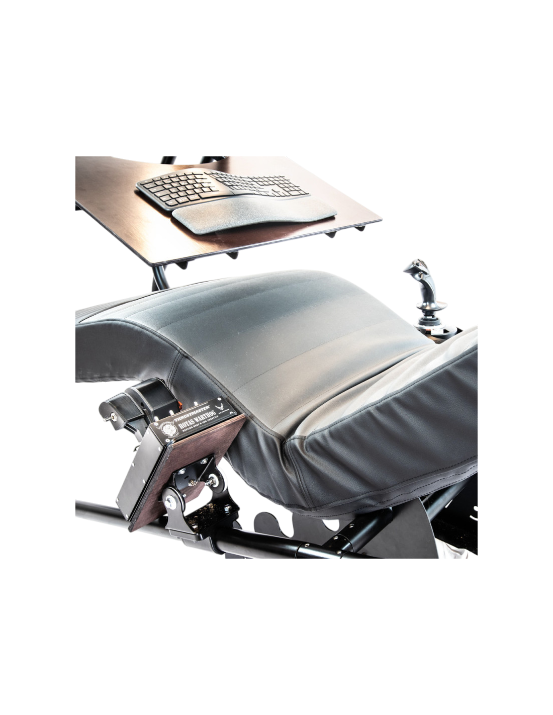 For the pilots among you - a flightstick base (15cm x 30cm) which can be mounted on either side of the Core Frame. Pivoting brackets make it possible to flip the flightstick down to enter / exit the gamestation. You can also loosen the pipe mount and slide the entire flightstick base all the way down to the floor if not needed for a longer period of time. There are no pre-drilled holes in the wood plate as we don't know what flightstick you'll be using. Depending on the mounting hole pattern of your flightstick - drill holes in the wooden base and attach your flightstick with appropriate bolts - then attach the wood base to the mounting bracket.